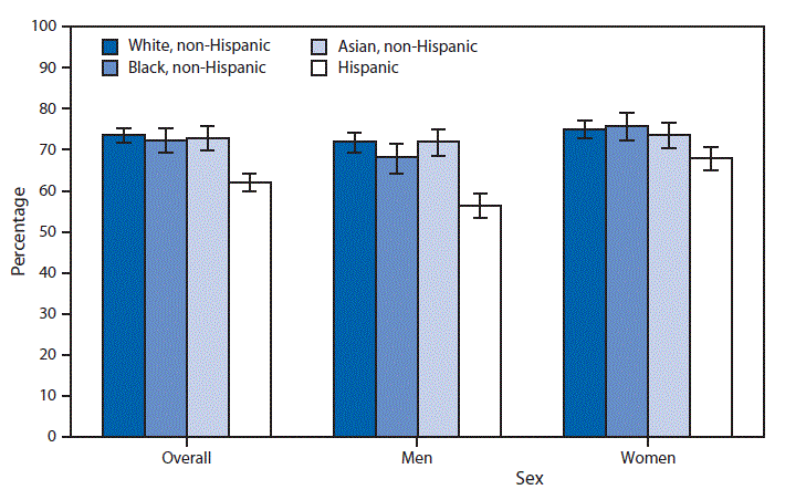 During 2011–2014, 71.2% of adults aged ≥20 years had their blood cholesterol checked in the past 5 years. A smaller percentage of Hispanic adults (62.1%) had their cholesterol checked in the past 5 years compared with non-Hispanic white (73.5%), non- Hispanic black (72.3%), and non-Hispanic Asian (72.9%) adults. This pattern was observed for both men and women. A larger percentage of non-Hispanic white, non-Hispanic black, and Hispanic women had their cholesterol checked compared with their male counterparts, but there was no difference between non-Hispanic Asian men and women.