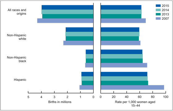 - From 2014 to 2015, the number of births for non-Hispanic white women declined 1%, whereas the number of births for Hispanic women rose 1%, and births to non-Hispanic black women were essentially unchanged.
