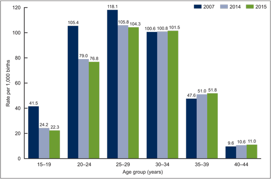 Figure 2. Birth rates, by age of mother: United States, 2007, 2014, and 2015