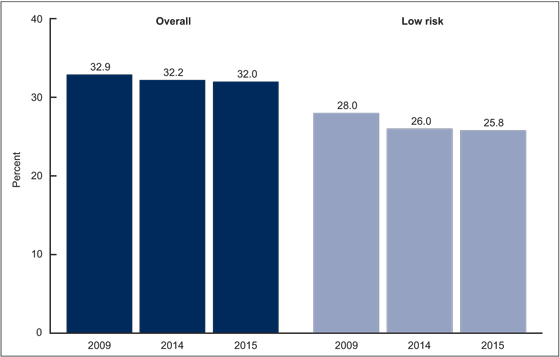 - From 2014 to 2015, the overall cesarean delivery rate declined 1%, from 32.2% to 32.0%. The low-risk cesarean delivery rate also declined 1%, from 26.0% to 25.8% from 2014 to 2015 (Figure 3).
