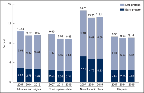 - Increases in preterm birth rates from 2014 to 2015 were observed for infants born to non-Hispanic black (13.23% to 13.41%) and Hispanic (9.03% to 9.14%) women; the rate for non-Hispanic white women was essentially stable at 8.88% in 2015 compared with 8.91% in 2014.