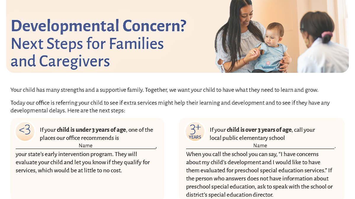 Use this free, printable handout with families and/or caregivers to support them in taking the next steps when developmental referrals are needed. Providers can fill in the types of referrals being made and let families know how to communicate any barriers they may be experiencing in the referral process.