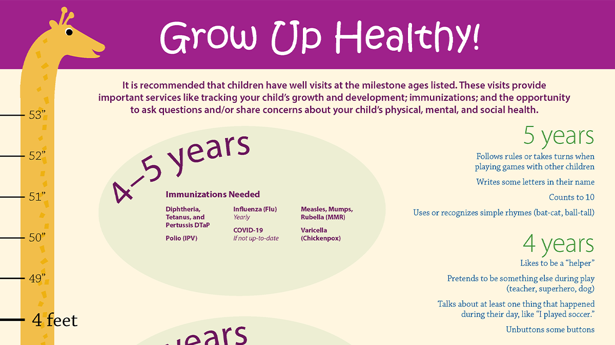 Promote the Grow Up Healthy Chart (including immunizations) chart. CDC's Grow Up Healthy Chart (including immunizations), developed by the Learn the Signs. Act Early. program, provides a fun and easy way for parents and caregivers to track and support their child's early development. Note - also includes Spanish version on second page.