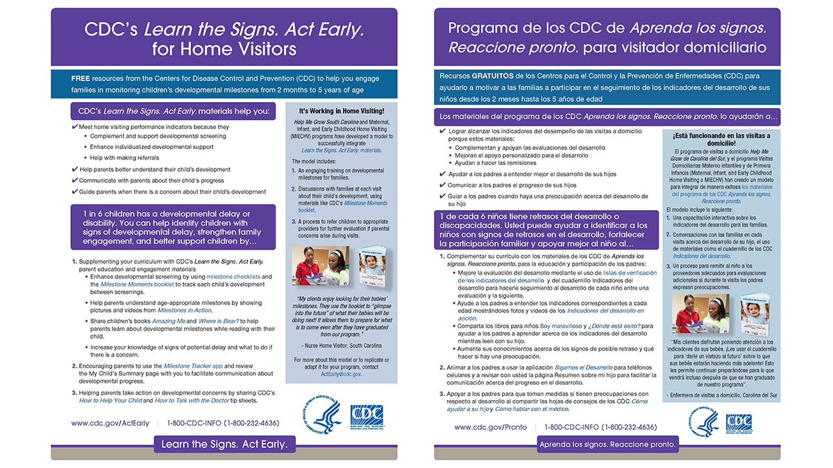 Quick guides provide helpful tips on ways to integrate Learn the Signs. Act Early. developmental monitoring resources across various settings. Download the quick guide for Home Visiting programs.