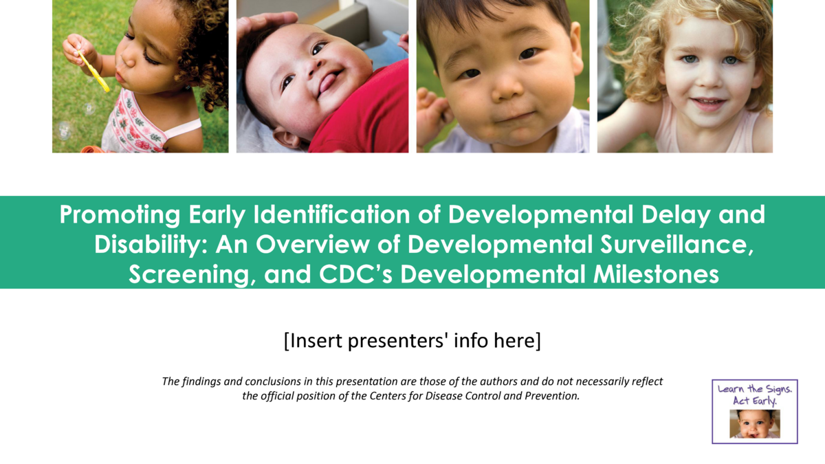 This presentation has been made available for the public to aid in the early identification of developmental delays in children and spread awareness about CDC's resources that support developmental monitoring.