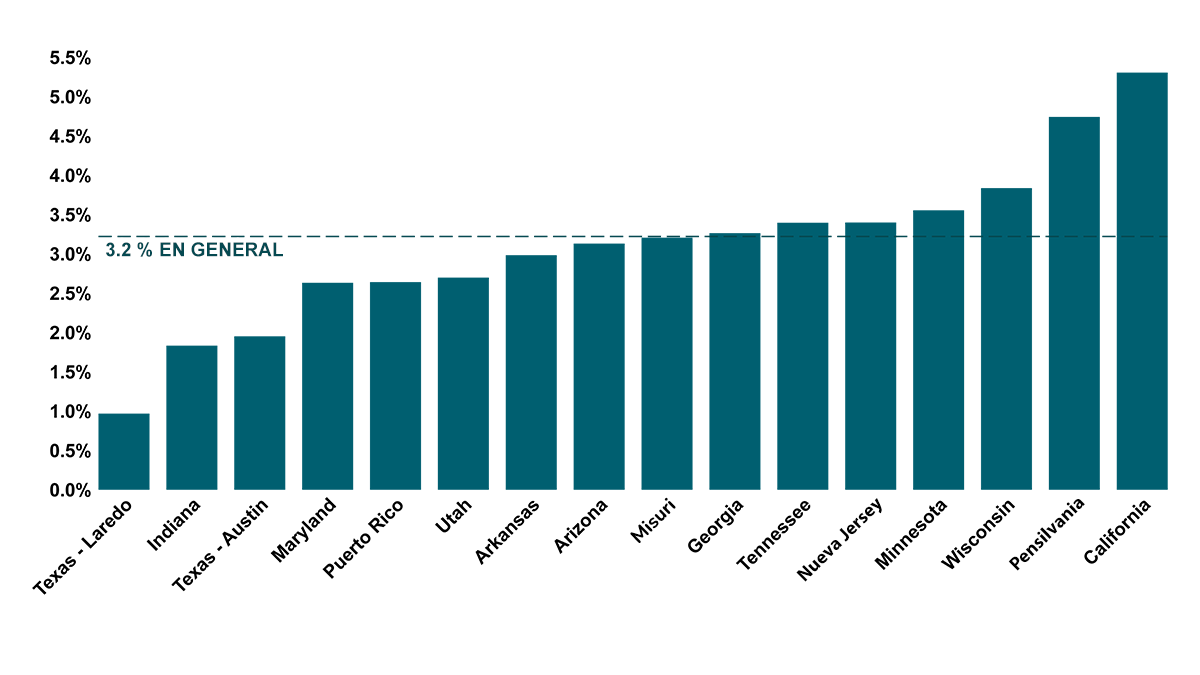 En los 16 sitios de la Red de ADDM, la prevalencia de TEA en general, o la cantidad de niños de 8 años en los que se identificó TEA en el 2022, fue de 1 de cada 31, pero hubo gran variabilidad por sitio. La prevalencia varió de 1 de cada 103 en Texas-Laredo a 1 de cada 19 en California.
