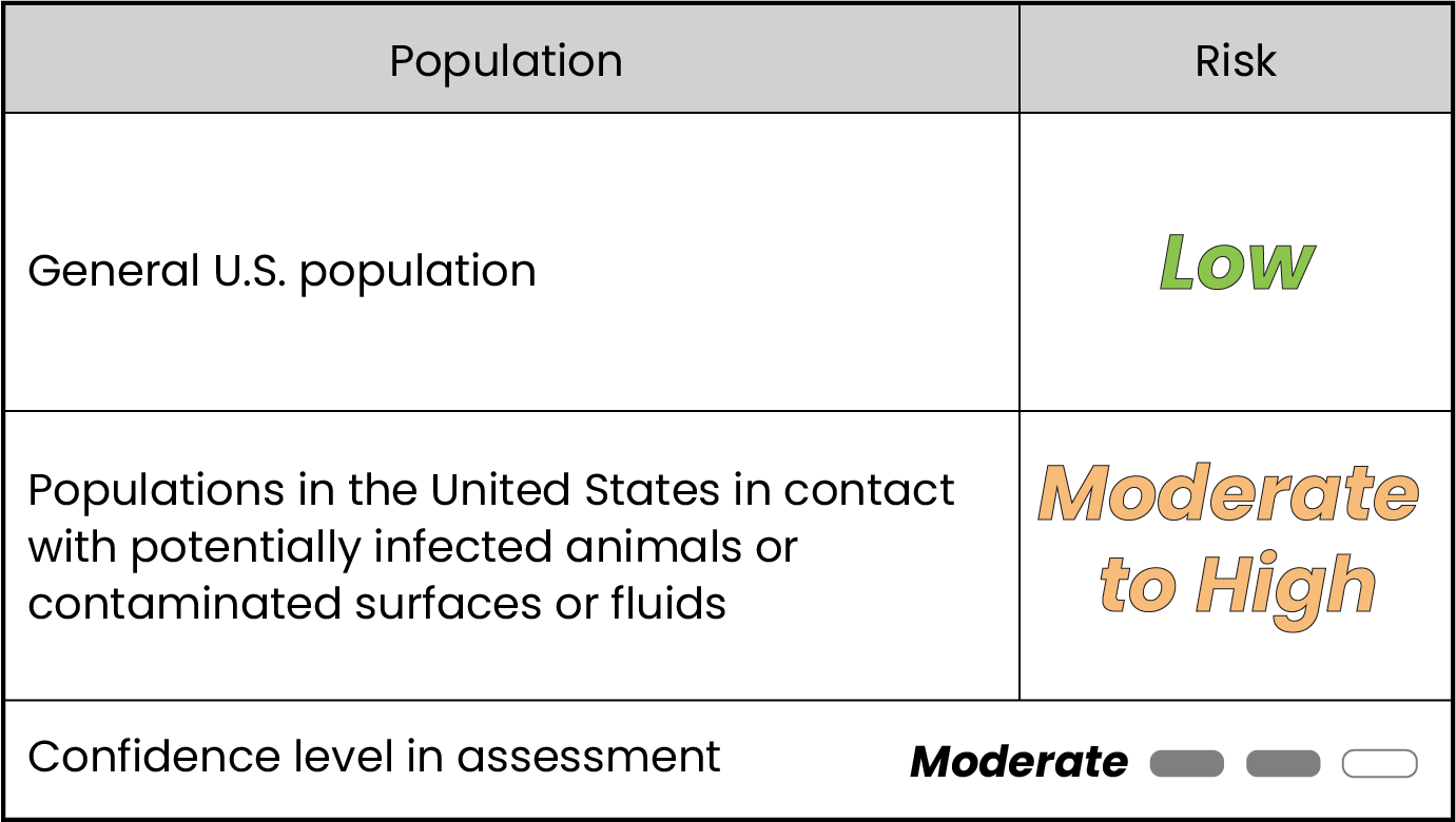 CDC assesses the overall risk to the general U.S. population as low, with moderate confidence. Of note, for any individual in this population, risk will vary depending on nature of, frequency, and time spent in contact with infected or potentially infected animals or contaminated surfaces or fluids. We also include a section below on factors that could change our assessment.