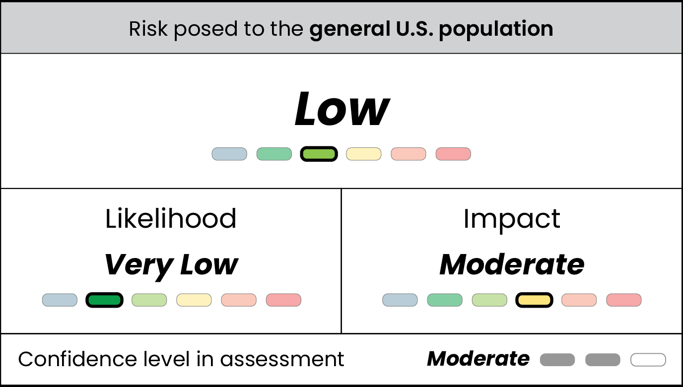 Overall risk was estimated by combining the likelihood of infection and the impact of disease. For example, low likelihood of infection combined with high impact of disease would result in moderate risk. The likelihood of infection refers to the probability that members of the general U.S. population become infected with H5N1 viruses—which in turn depends on the likelihood of exposure, infectiousness of the pathogen, and susceptibility of the population.The impact of infection considers several factors, including the severity of disease, level of population immunity, availability of treatments, and necessary public health response resources. A degree of confidence was assigned to each level of the assessment, taking into account evidence quality, extent, and corroboration of information.