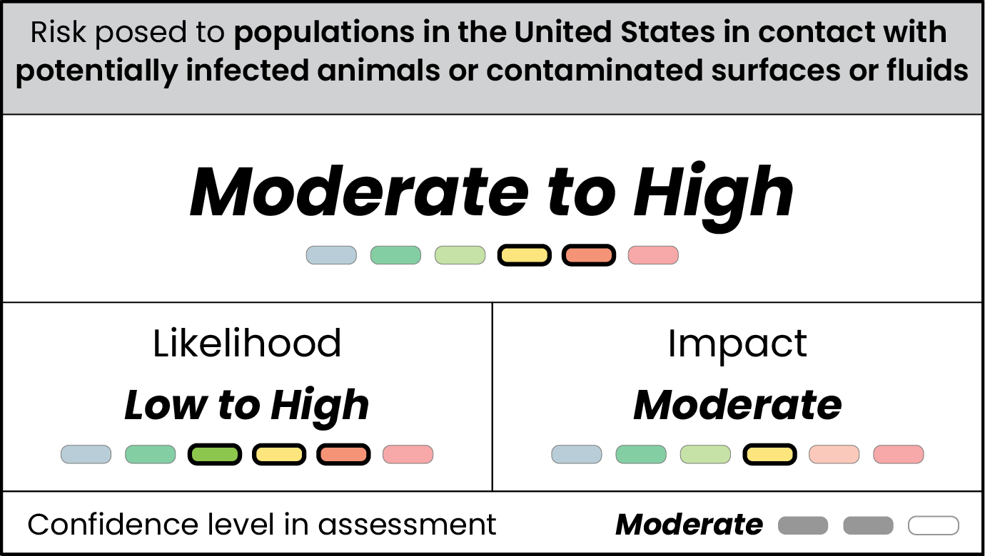 The risk posed by H5N1 viruses to humans in contact with potentially infected animals or contaminated surfaces or fluids is moderate to high. Of note, for any individual in this population, risk will vary depending on use of workplace controls including personal protective equipment (PPE), nature and frequency of exposure, and time spent in contact with infected or potentially infected animals or contaminated surfaces or fluids. We also include a section below on factors that could change our assessment.