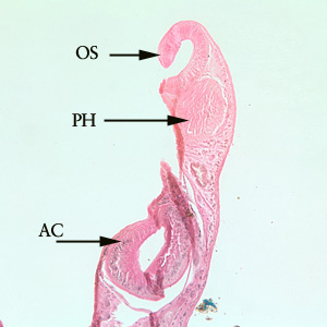 A 47-year-old male with travel history to the Galapagos Islands, Ecuador and Colombia presented to his health care provider with follicular conjunctivitis. A worm-like object measuring approximately 3.0 mm was removed from his eye and sent to a pathology laboratory for analysis. The object was sectioned, stained with hematoxylin and eosin (H&E) and examined microscopically. Figure A shows the object at 40x magnification; Figure B shows a close-up of one end of the object at 100x magnification. What is your diagnosis? Based on what criteria?