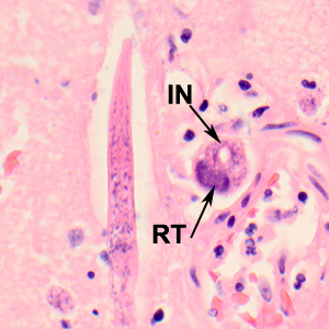 A 65-year-old patient was admitted to the hospital with fever, nausea, and vomiting after recently being treated as an outpatient for a urinary tract infection. Her past medical history included being diagnosed with bipolar disorder, hypertension, osteoarthritis, and compression fractures. She was a smoker and the only known animal contacts were her pet dogs. During hospitalization, her mental health continued to decline and she was pronounced brain-dead after one month’s stay at the hospital. CT and MRI scans of her brain prior to death did not show any focal lesions. An autopsy was performed and cultures of brain tissue were negative for bacterial and viral agents. Sections of brain tissue were processed by Pathology and stained with hematoxylin and eosin (H&E). Figures A–B show what was observed by the attending pathologist. Images were captured and sent to the DPDx Team for diagnostic assistance. What is your diagnosis? Based on what criteria?