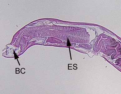 A worm-like object was removed during a routine colonoscopy performed on a 65-year-old male patient. The patient had no gastrointestinal complaints and no documented international travel. The object measured approximately 11.0 mm in length. The specimen was sent to Pathology for routine histological work-up, including sectioning and staining with hematoxylin-and-eosin (H&E). Digital images were captured and sent to the DPDx Team for diagnostic assistance. Figures A–D show four of the images sent for consultation. Follow-up ova-and-parasite (O&P) examinations of stool were negative. What is your diagnosis? Based on what criteria?