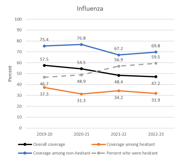 - Influenza vaccination coverage decreased from 57.5% in 2019–20 to 47.2% in 2022–23, while the percent of women reporting hesitancy towards influenza vaccination increased from 46.7% in 2019–20 to 59.5% in 2022–23 (Figure 1).