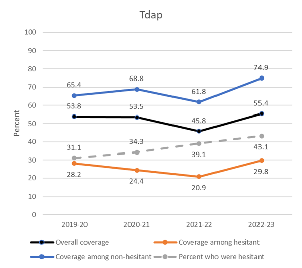 - Tdap vaccination coverage was similar in 2019–20 (53.8%) and 2022–23 (55.4%), though coverage decreased between 2020–21 and 2021–22, while the percent of women reporting hesitancy towards Tdap increased from 31.1% in 2019–20 to 43.1% in 2022–23.