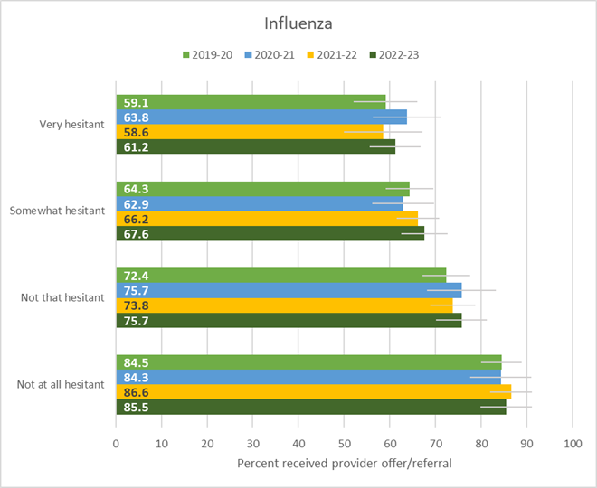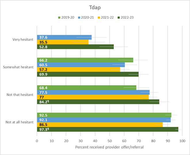 - For influenza vaccine and Tdap, the likelihood of reporting receipt of a provider offer or referral for vaccination decreases as the degree of hesitancy increases.