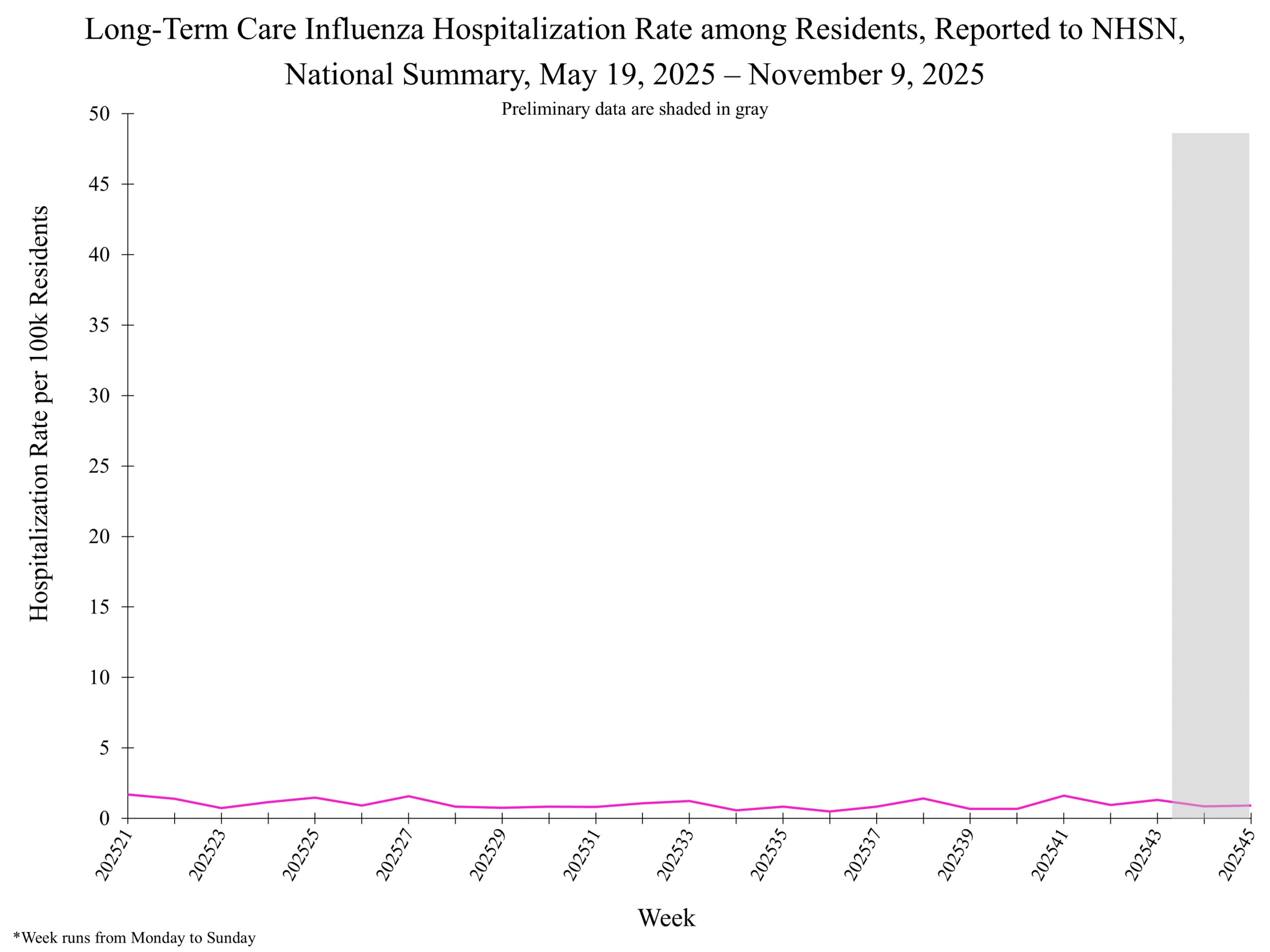 Hospitals report to NHSN the weekly number of patients with laboratory-confirmed influenza who were admitted to the hospital. Nationally, during Week 45, 1,665 laboratory-confirmed influenza-associated hospitalizations were reported. This week's number of influenza-associated hospitalizations increased (change of ≥ 5%) slightly compared to Week 44.