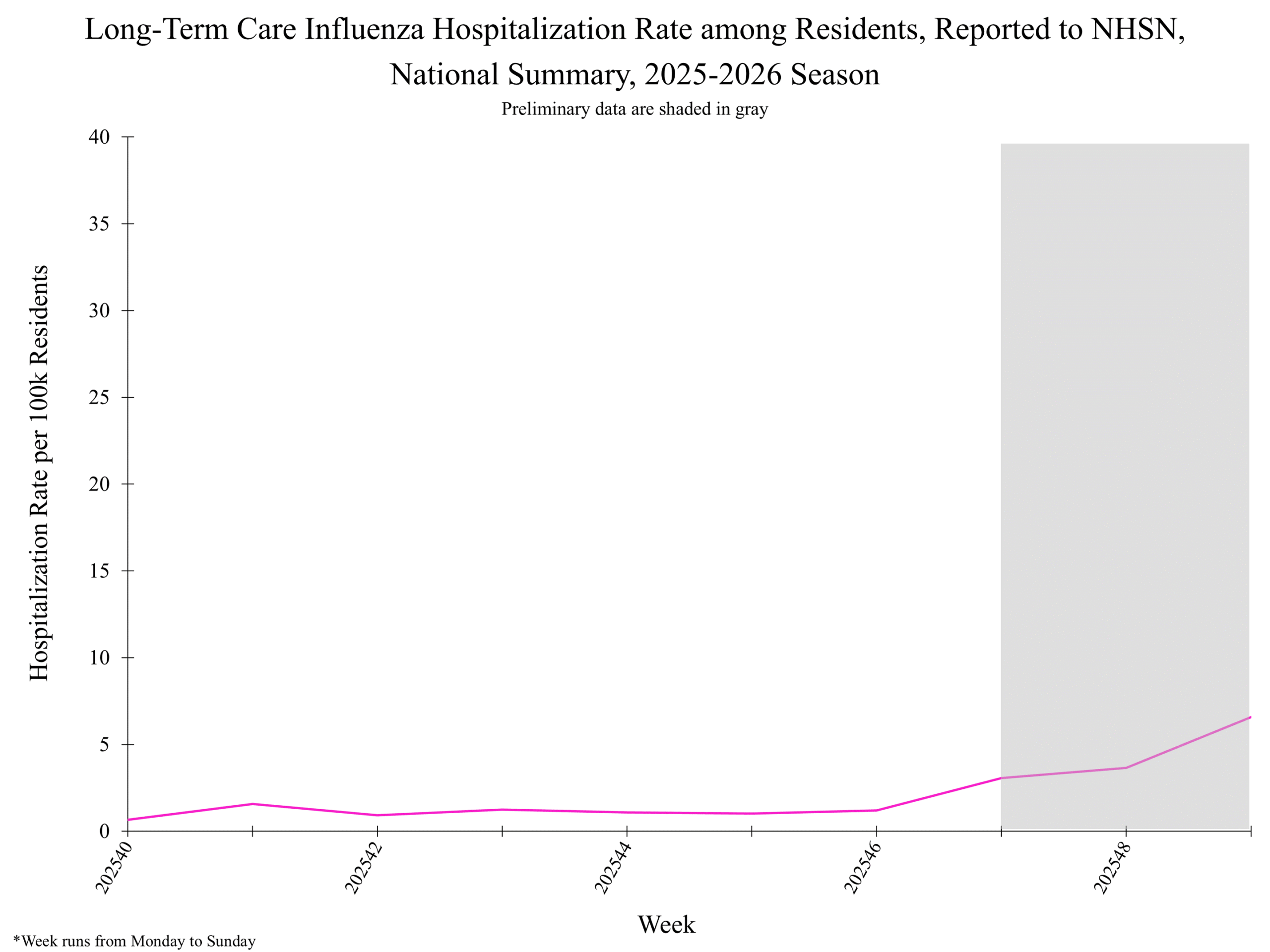 A total of 2,415 laboratory-confirmed influenza-associated hospitalizations were reported by FluSurv-NET sites between October 1, 2025, and December 6, 2025. The weekly hospitalization rate observed during Week 49 was 2.2 per 100,000 population, which increased from a rate of 1.7 per 100,000 population last week. The cumulative hospitalization rate observed in Week 49 was 6.9 per 100,000 population. This is the third highest cumulative rate at Week 49 since the 2010-11 season following the 2022-23 and 2023-24 seasons, with rates of 36.1 and 9.5 respectively.