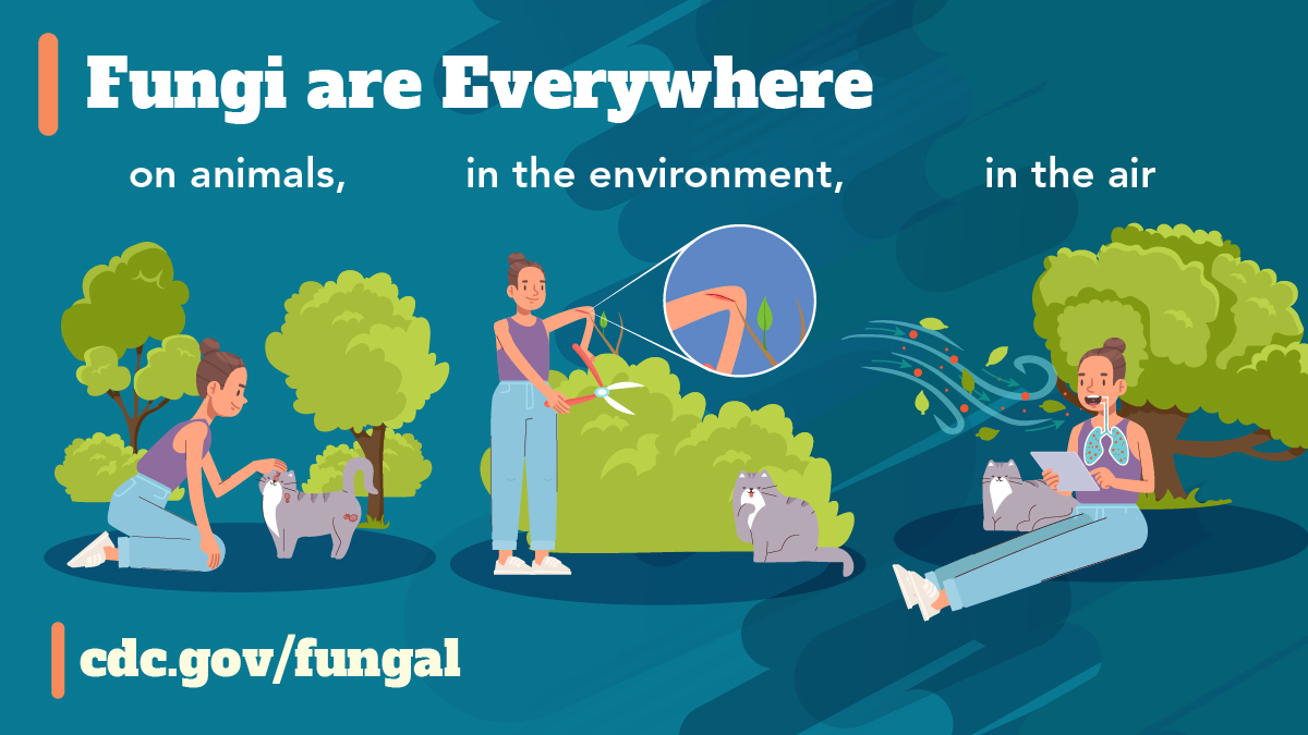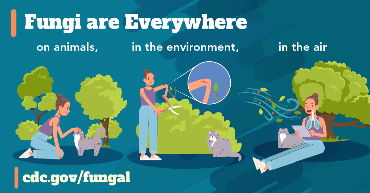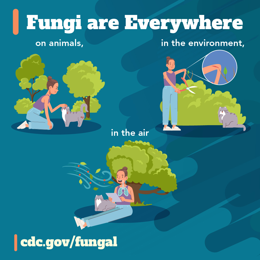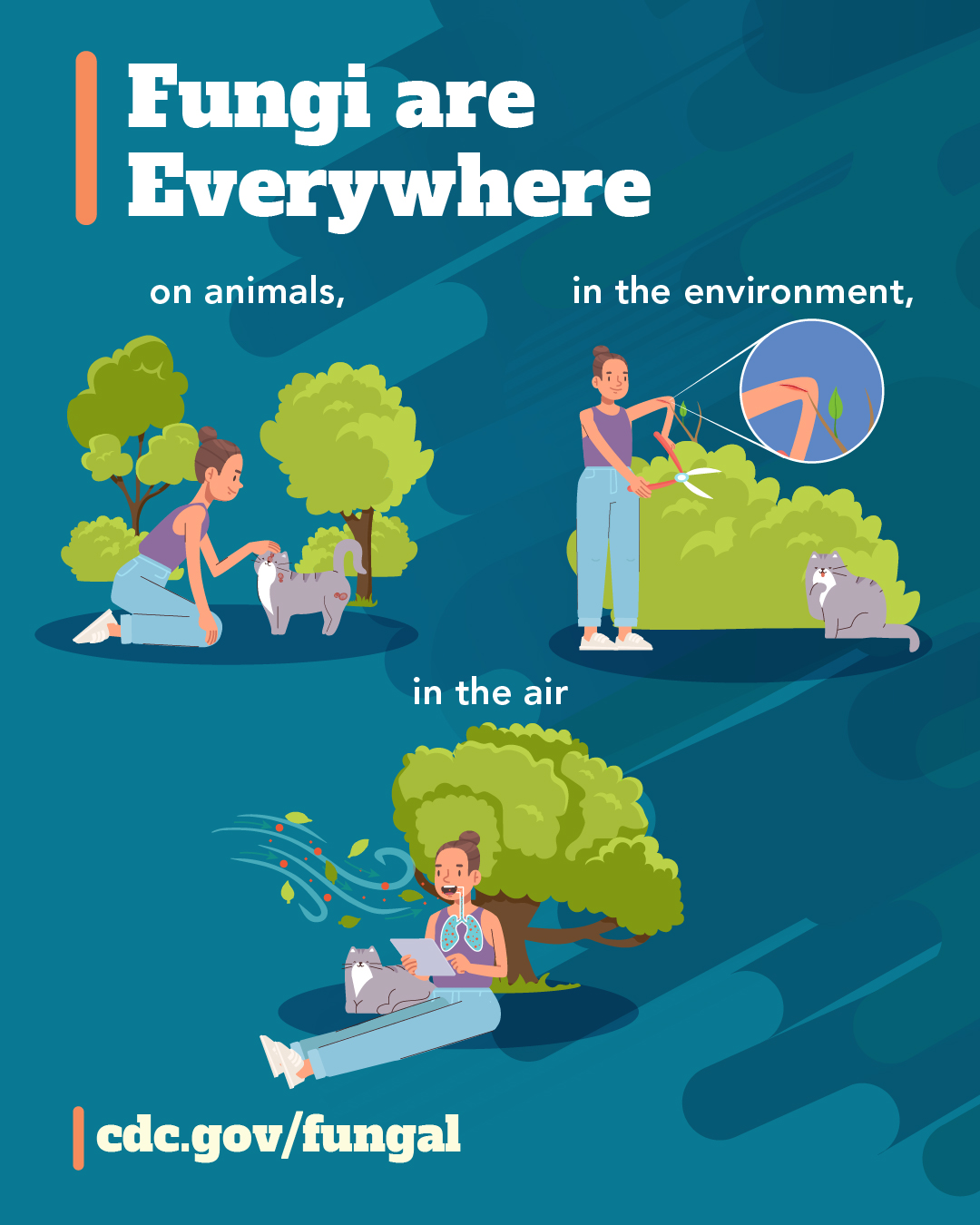 People can get fungal diseases from contact with an infected animal, skin scrapes that are exposed to fungi in dirt or plants, and from breathing fungal spores in the air. Learn about how fungal diseases are a One Health issue. #FungalWeek25 https://bit.ly/4cvKYKN (267 characters)