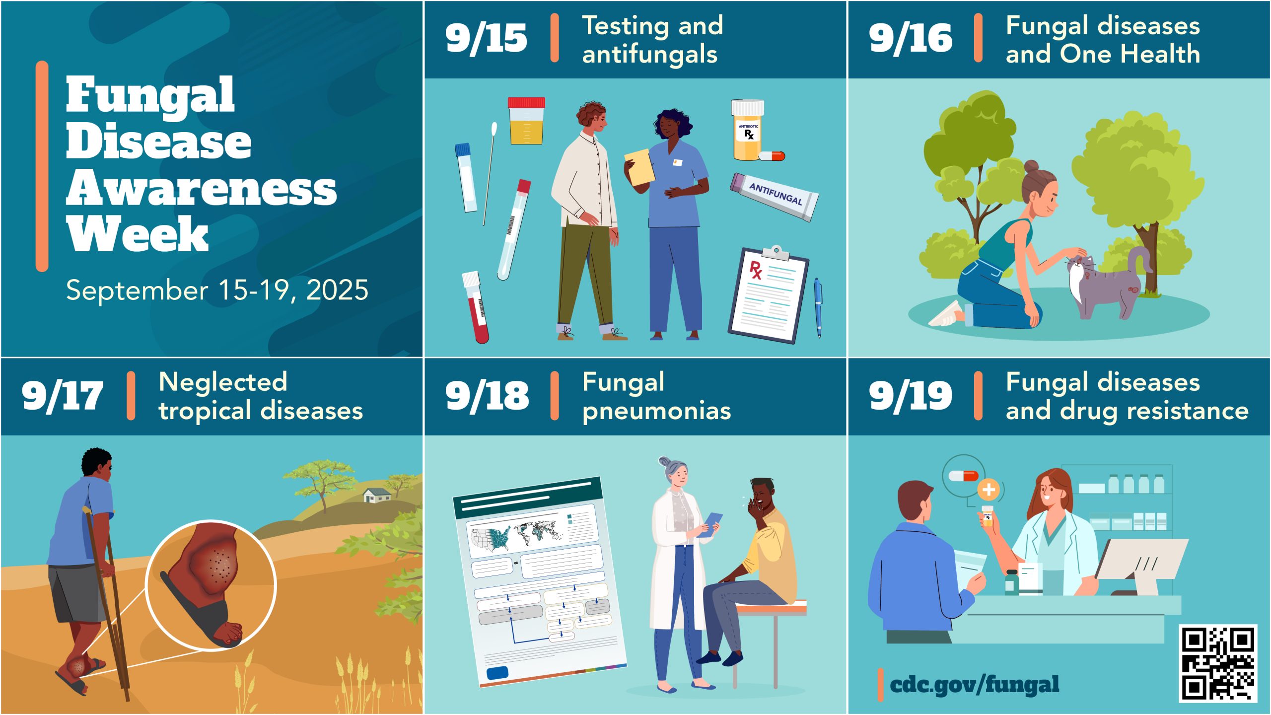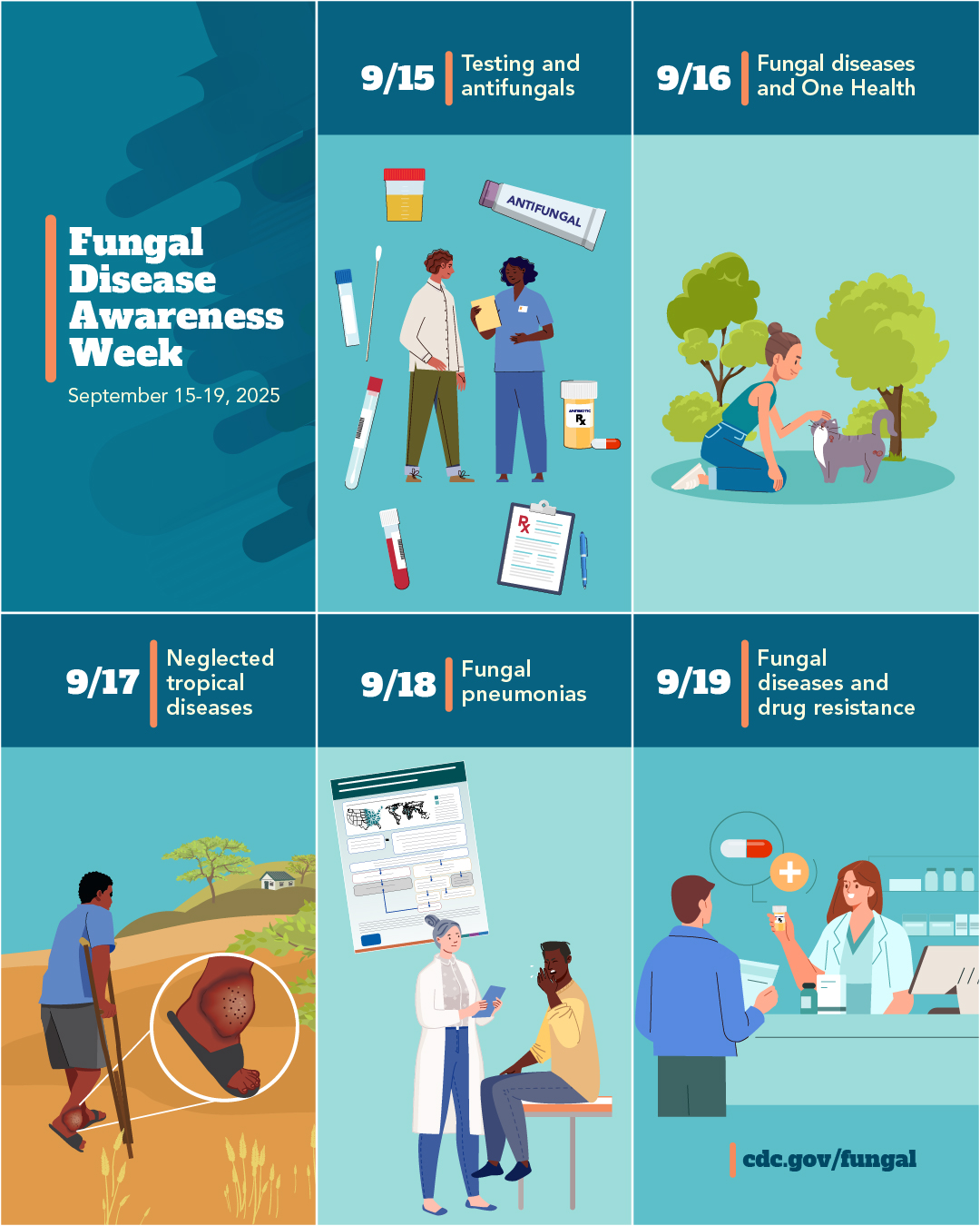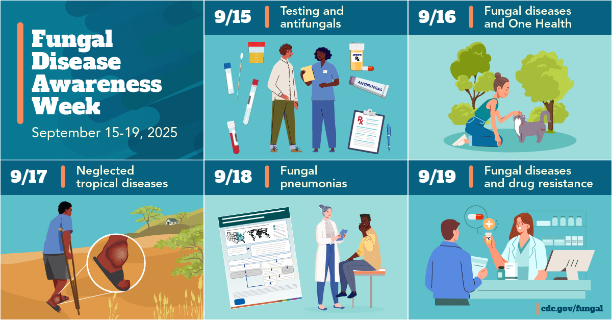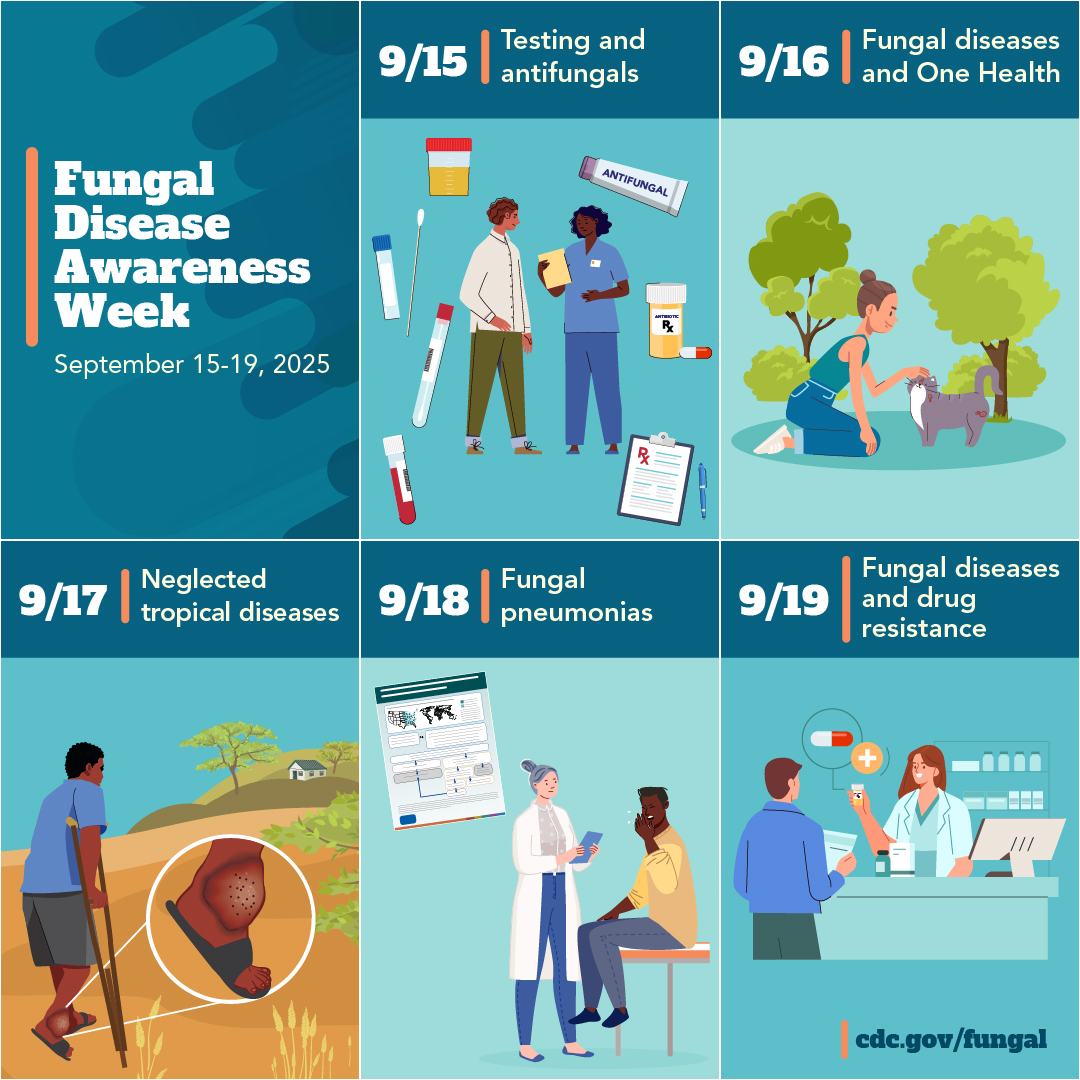 Fungal Disease Awareness Week is September 15-19. Each day will highlight a different fungal disease topic. For #FungalWeek25, raise awareness to help protect people, plants, and animals from the growing impact of fungal diseases. https://bit.ly/4dyCy6u (253 characters)