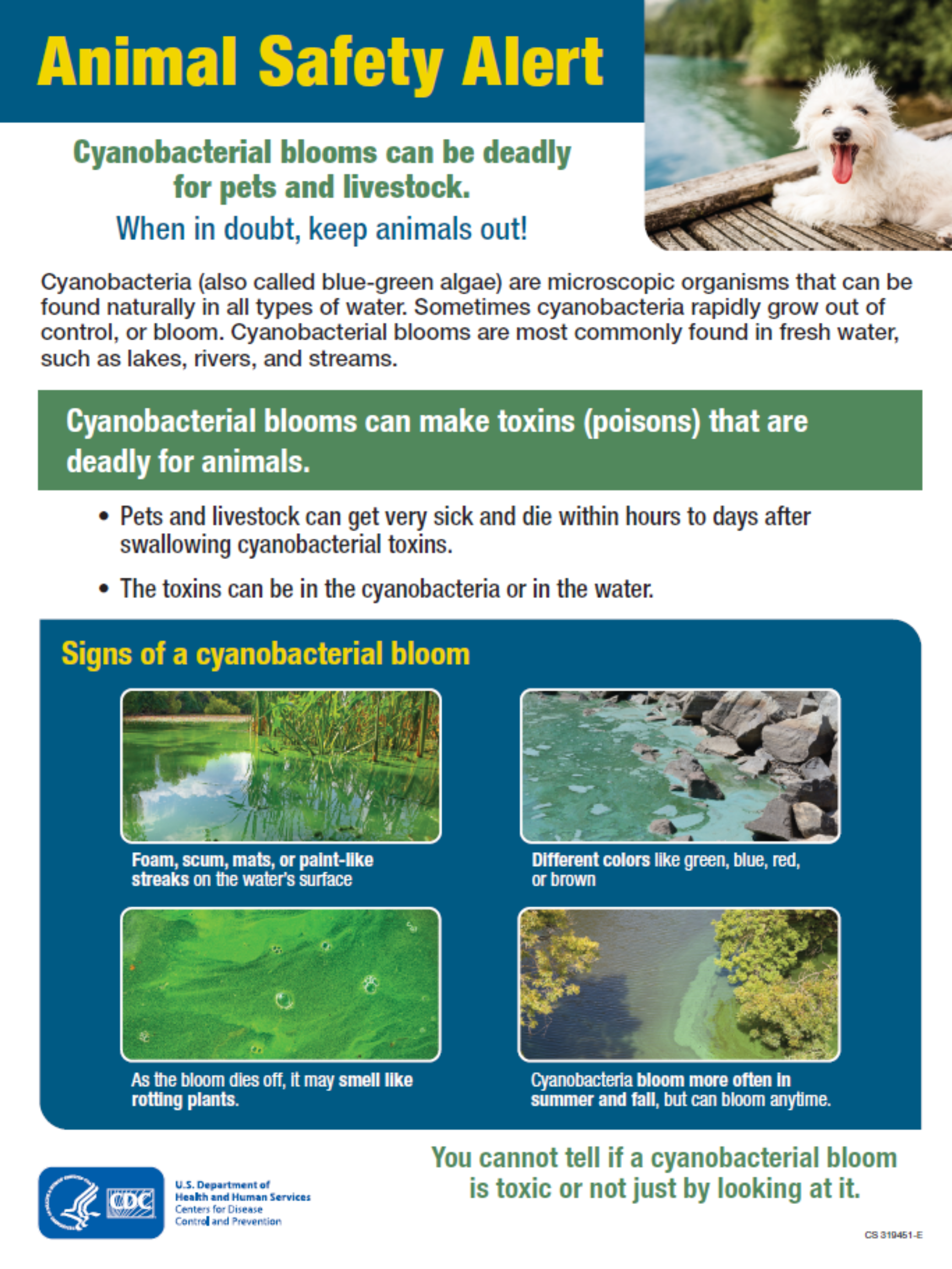 Harmful algae can be deadly for pets and livestock. Keep your animals away from water with signs of harmful algae, like scum or changes in the water's color.