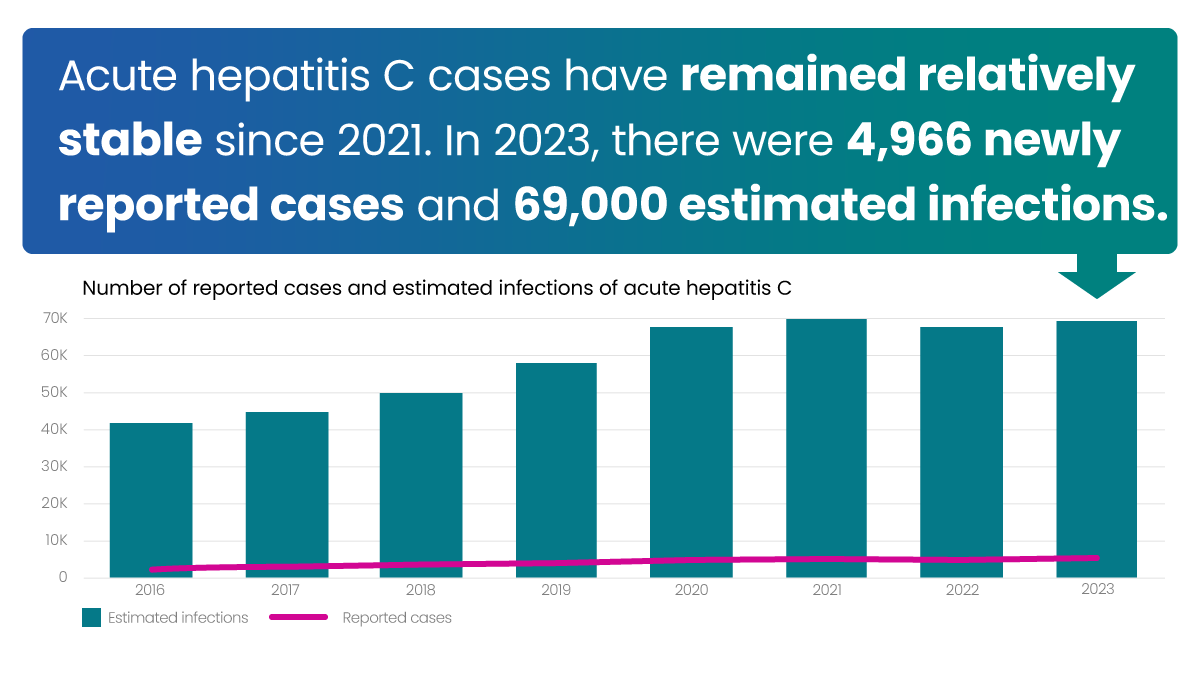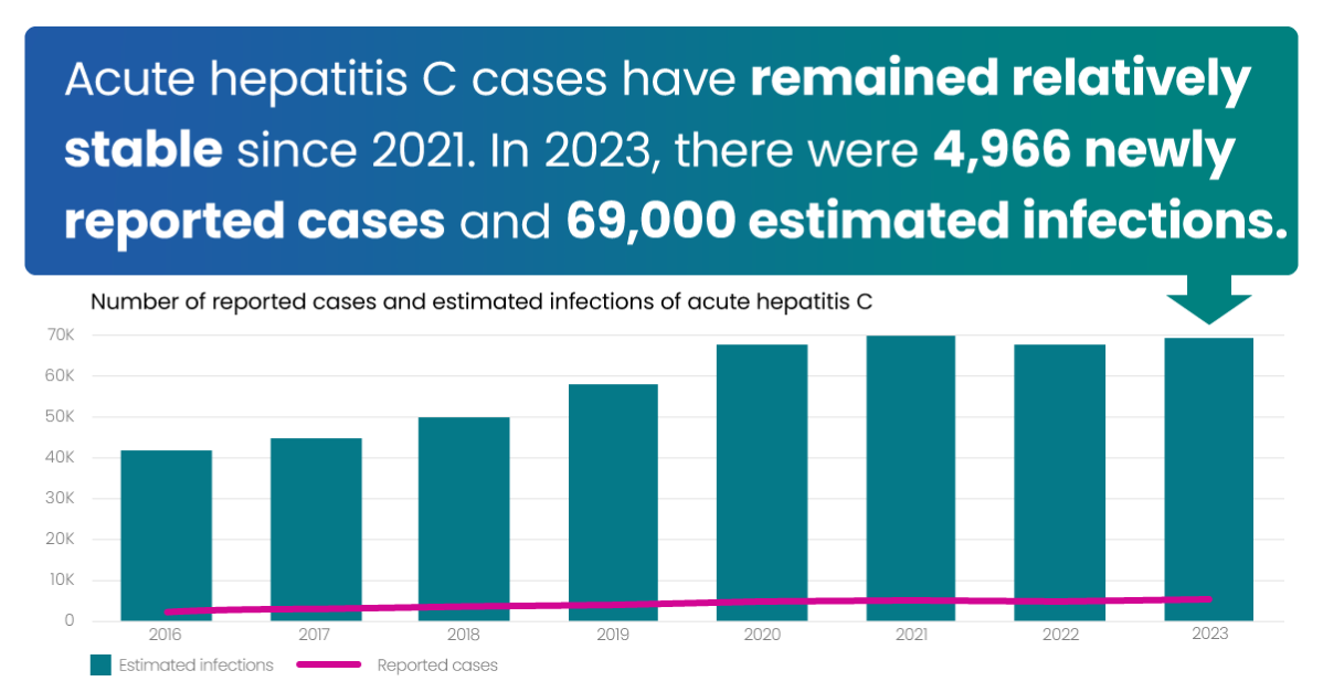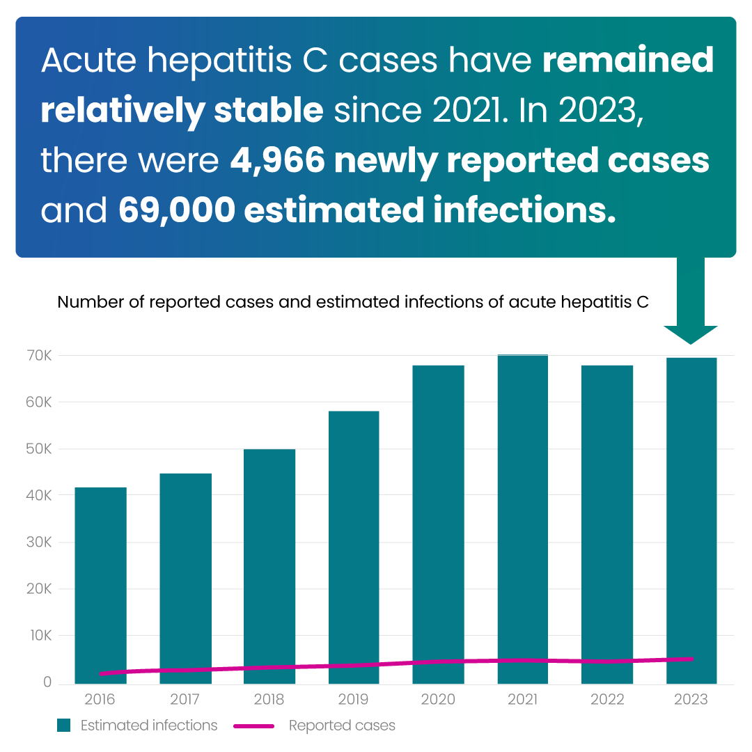- After a decade of increasing rates of reported cases of acute #HepatitisC, rates remained relatively stable from 2021 – 2023. This #HepatitisAwarenessMonth, explore CDC's latest Viral Hepatitis Surveillance Report to see how curative hepatitis C treatment is saving lives. https://bit.ly/44gP2y0