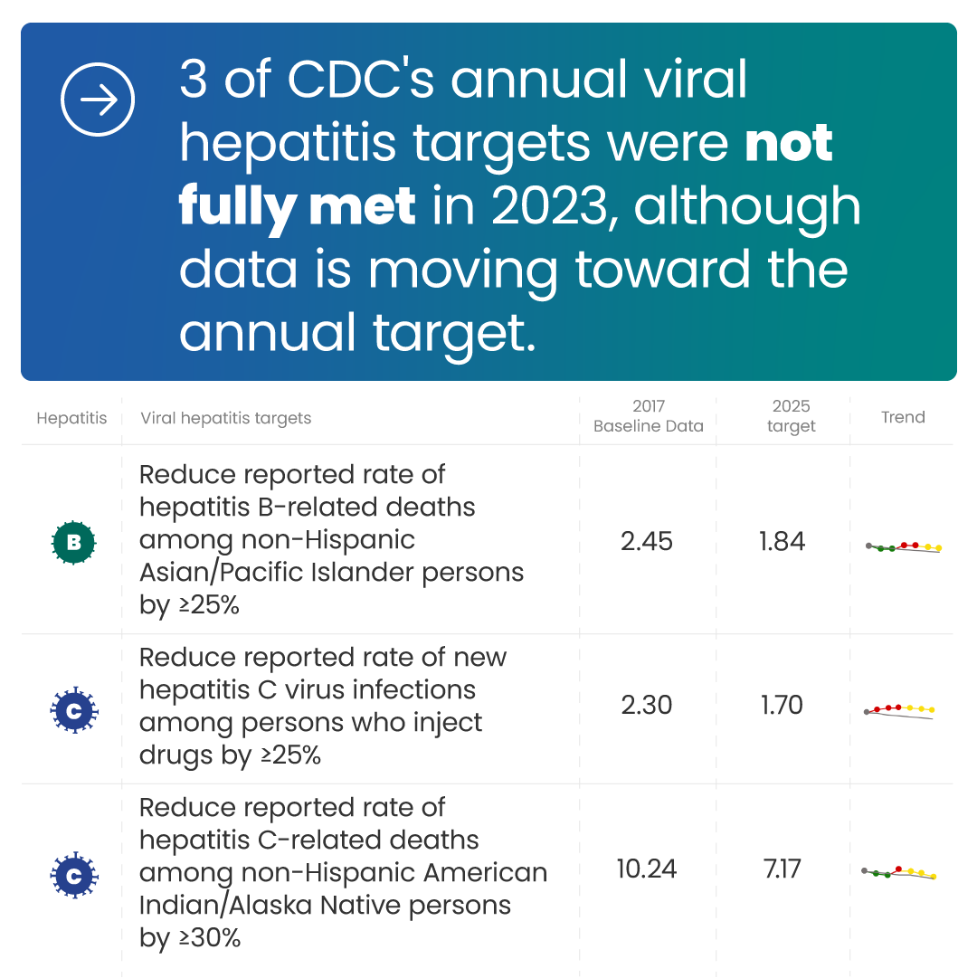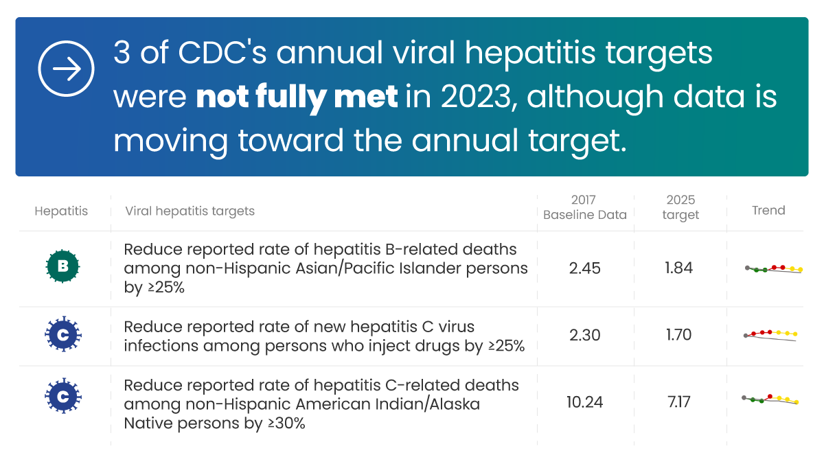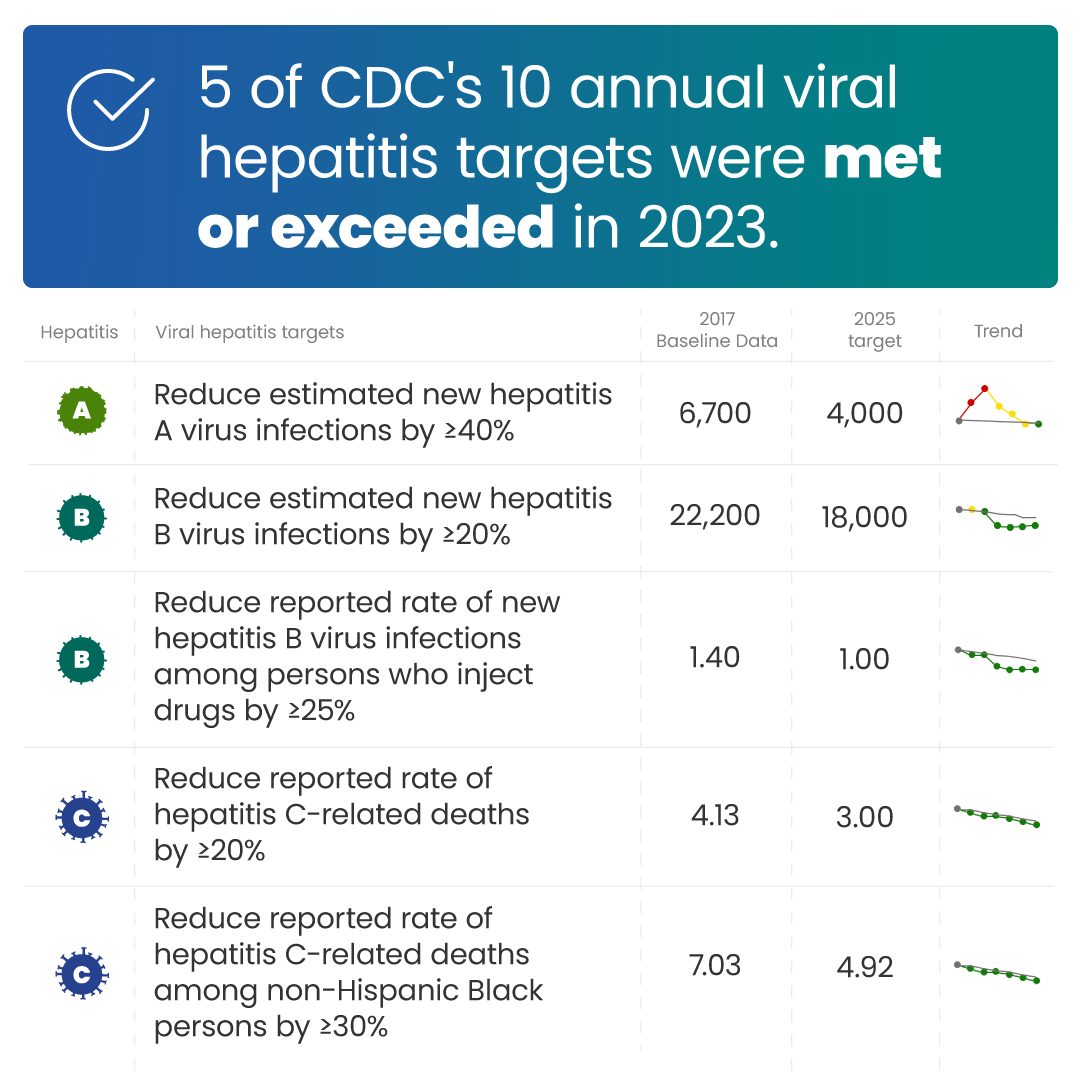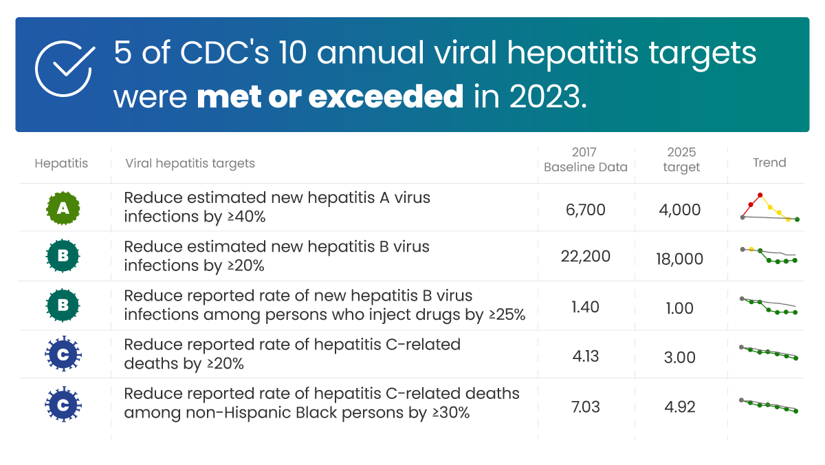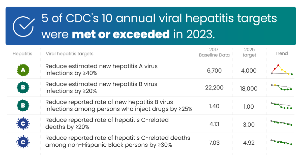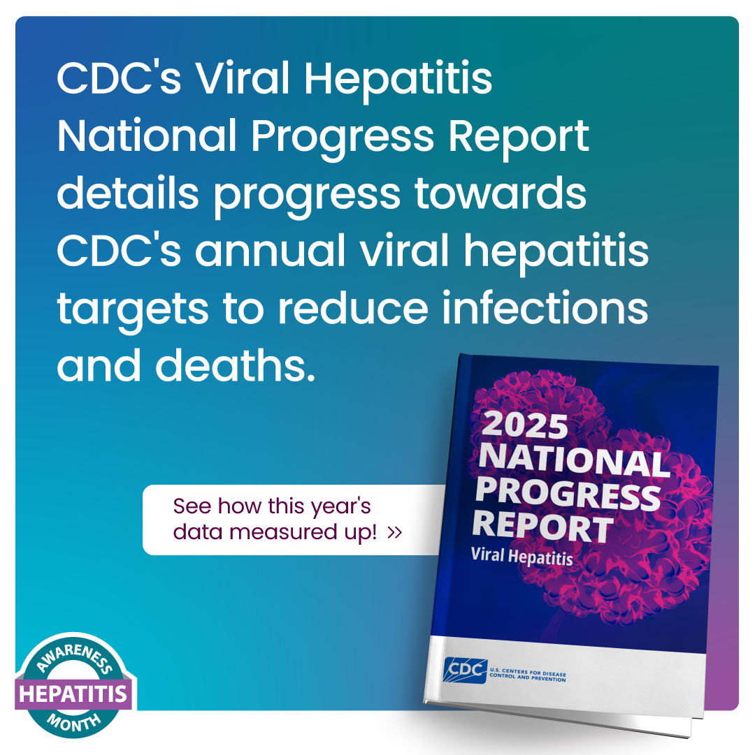 - In 2020, CDC released 10 key goals aiming to reduce viral hepatitis infections and deaths. In recognition of Hepatitis Awareness Month, explore the Viral Hepatitis National Progress Report to see how the nation has been tracking against these goals: https://bit.ly/DVH2025NPR