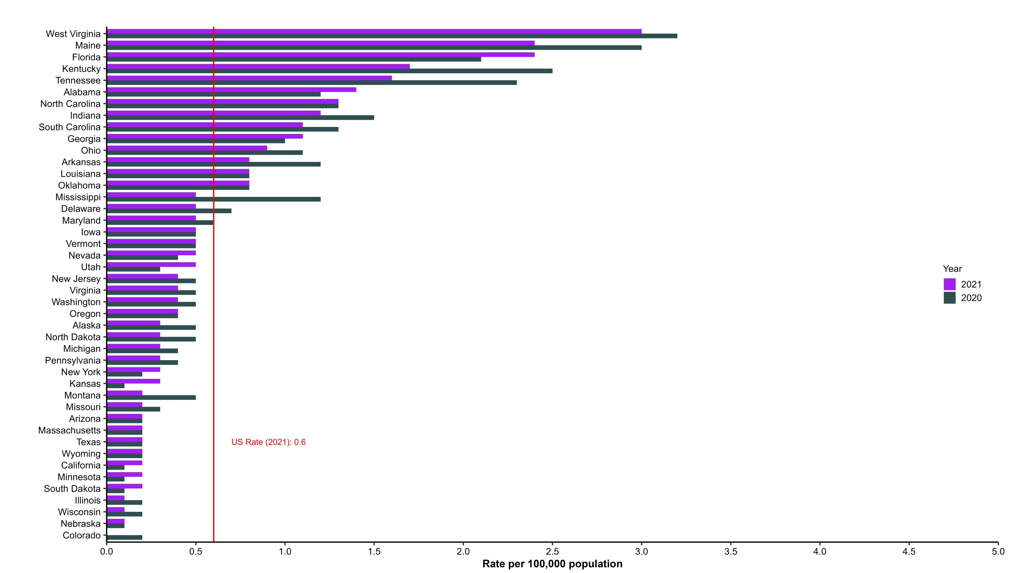 Only states with rates for 2020 and 2021 are shown. State/jurisdiction and year for no reported cases: Connecticut (2021, 2020), Hawaii (2021, 2020), New Hampshire (2020), New Mexico (2020), Idaho (2020); for unavailable data: District of Columbia (2021, 2020), Rhode Island (2021, 2020).