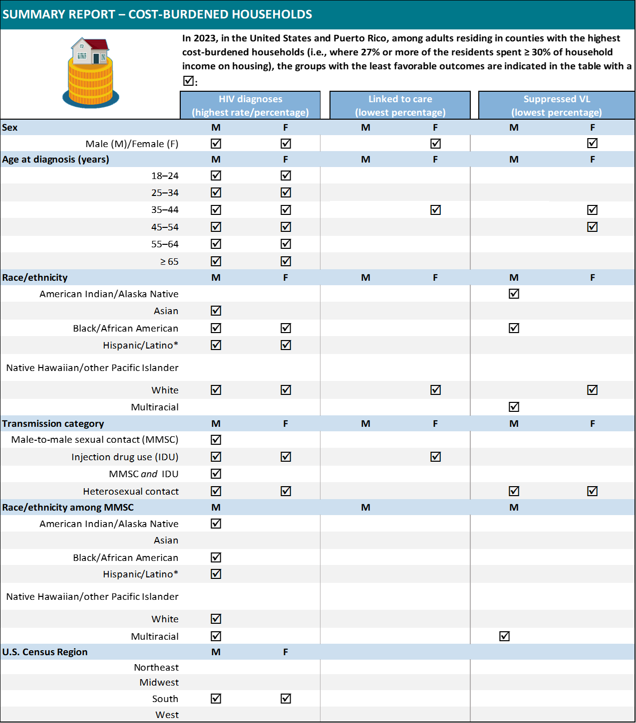 Data presented in Social Determinants of Health and Selected Care Outcomes among Adults with HIV Diagnosed during 2023 in the United States and Puerto Rico are based on cases reports from 50 states, the District of Columbia, and Puerto Rico. HIV surveillance data are geocoded to the county level by address of residence at the time of diagnosis and linked to county-level SDOH data from the ACS. For 2023 data, approximately 8% of these geocoded addresses are non-residential. Cases were excluded if a county could not be associated with the case. Counties were excluded if SDOH information was not available for the county, or the assigned county could not be matched to a county provided by the ACS. Although HIV diagnosis data associated with these exclusions were not included in all SDOH subpopulation totals, they were included in the overall subtotals stratified by sex. Consequently, all tables display varying denominators for SDOH subpopulation categories.