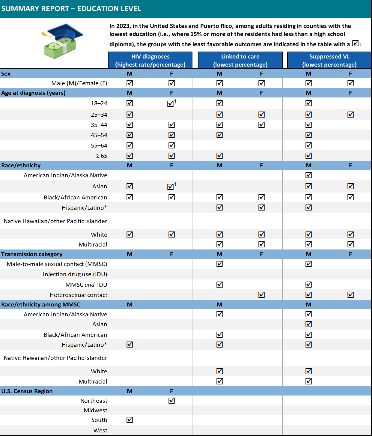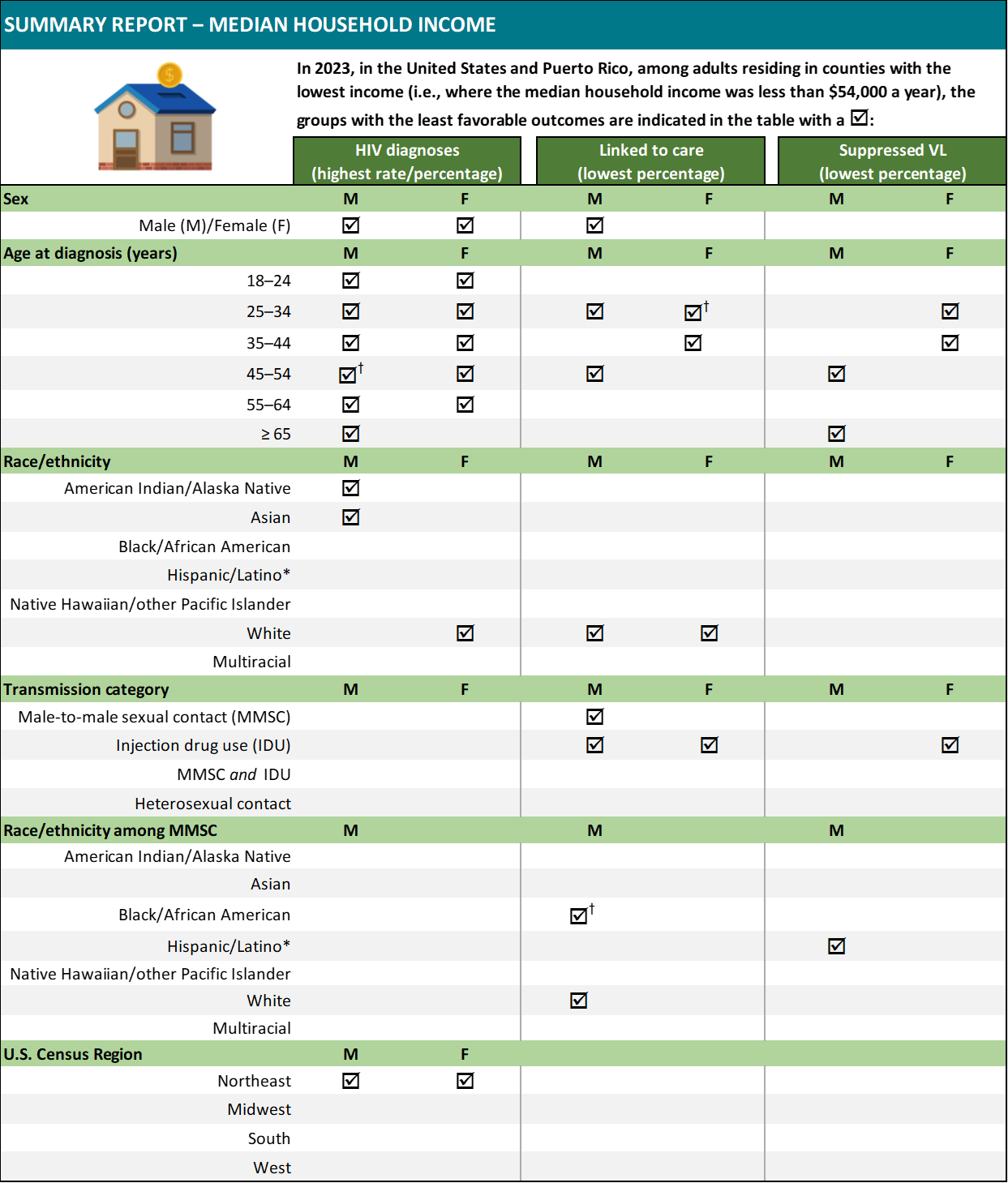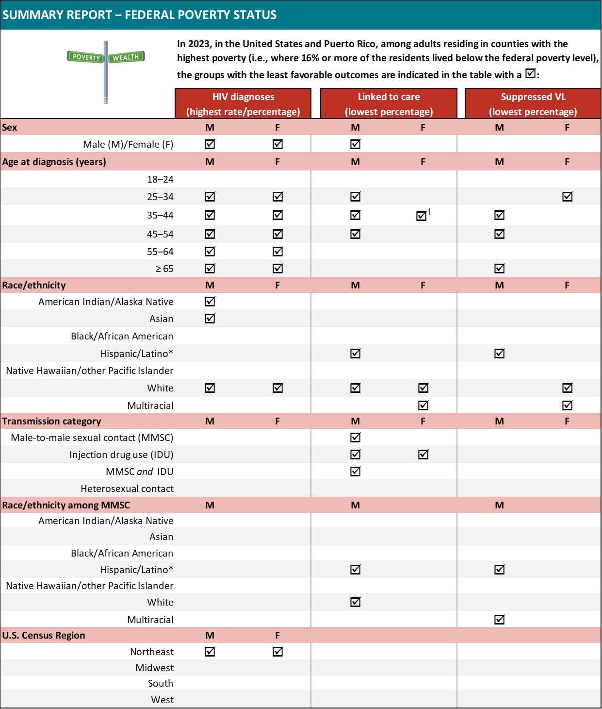 This section presents data for adults with HIV diagnosed during 2023, by selected SDOH indicators. Each report card focuses on one SDOH indicator and identifies the groups living in counties with the greatest economic and social challenges who had the least favorable outcomes: