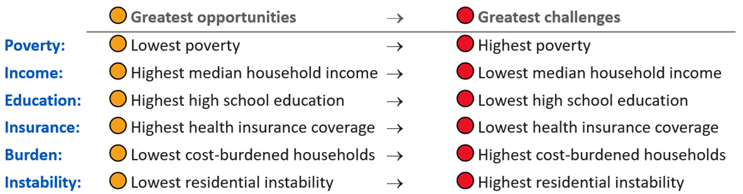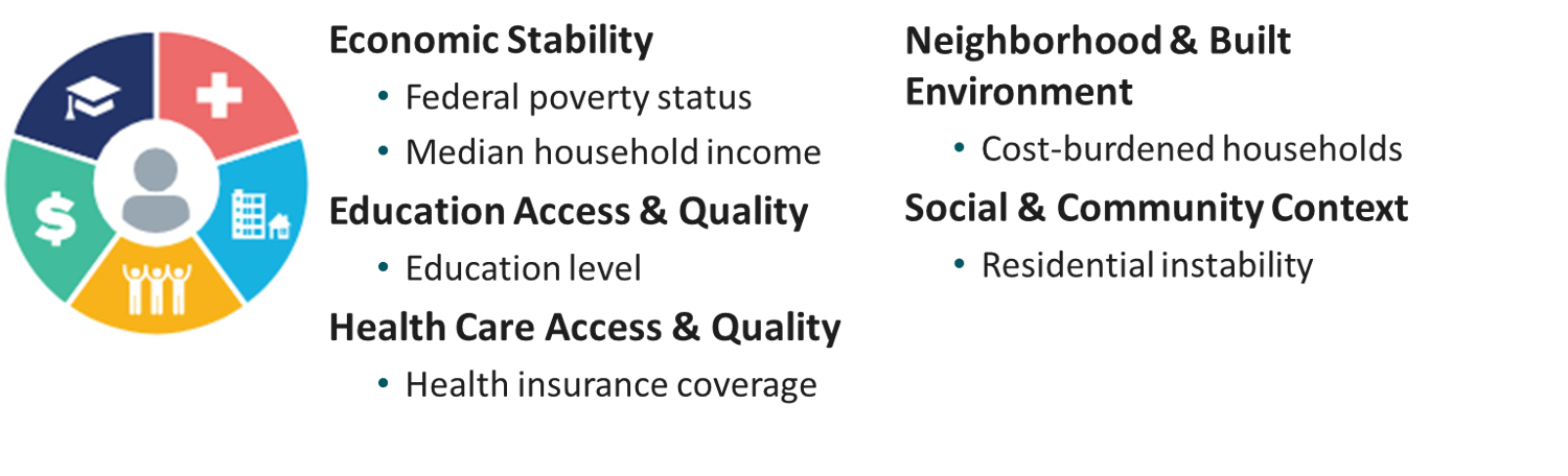 Healthy People 2030 identifies 5 key domains of SDOH: economic stability, education access and quality, healthcare access and quality, neighborhood and built environment, and social and community context. For this report, we selected at least 1 indicator from each SDOH domain, which includes: federal poverty status, median household income, education level, health insurance coverage, cost-burdened household, and residential instability.