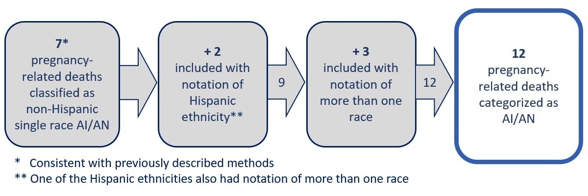 In the 2020 MMRIA data, 7 pregnancy-related deaths were classified as non-Hispanic single-race AI/AN. As shown in Figure 2, by using an alternate approach to classifying available vital records information on race and ethnicity, 12 pregnancy-related deaths were classified as AI/AN.