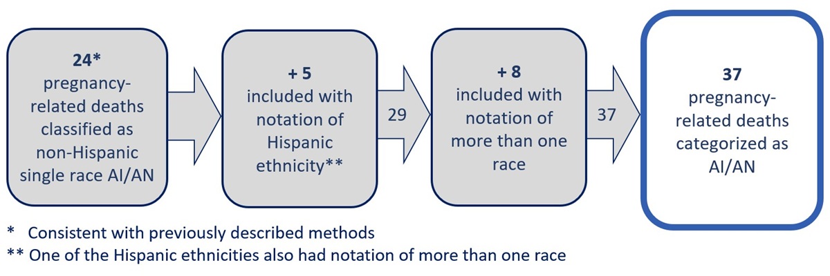 Methodological decisions about racial classification can affect the size and characteristics of the population used in an analysis. Assessments from other groups123 have demonstrated the importance of examining pregnancy-related deaths among all American Indian or Alaska Native (AI/AN) women, regardless of notation of Hispanic origin or other/multiple races. We used an approach which classifies non-Hispanic single-race AI/AN, and AI/AN in combination with any other race or ethnicity as American Indian or Alaska Native.