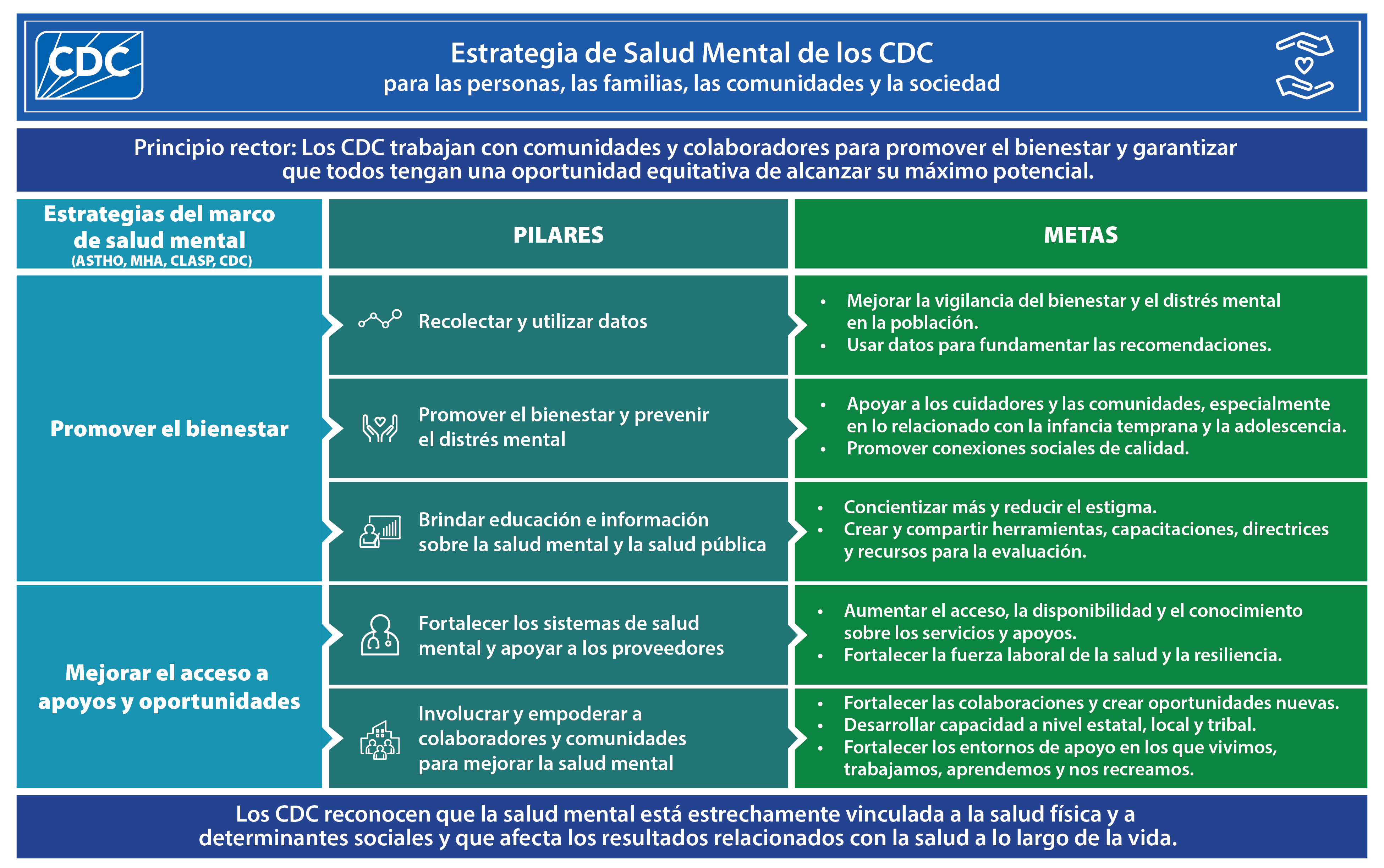 La "Estrategia de Salud Mental de los CDC" se basa en el marco de salud mental creado de manera colaborativa entre los CDC, la Asociación de Funcionarios de Salud Estatales y Territoriales (ASTHO), Mental Health America (MHA) y el Center for Law and Social Policy (CLASP) en octubre del 2023.