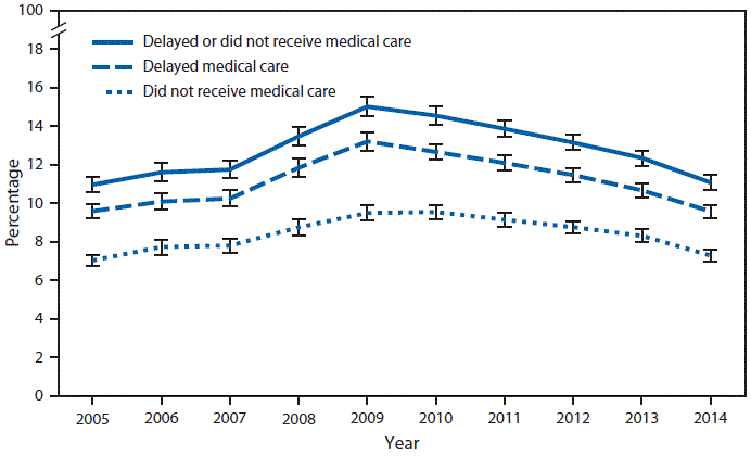 From 2005 to 2014, the percentage of adults aged 18–64 years who delayed or did not receive medical care because of cost increased from 11.0% (20.2 million) in 2005 to 15.1% (28.7 million) in 2009, and then decreased to 11.2% (21.7 million) in 2014. During the same period, the percentage of adults aged 18–64 years who delayed medical care because of cost increased from 9.7% (17.6 million) in 2005 to 13.3% (25.2 million) in 2009, and then decreased to 9.6% (18.8 million) in 2014. In addition, the percentage of adults aged 18–64 years who did not receive medical care because of cost increased from 7.1% (12.9 million) in 2005 to 9.6% in 2009 and 2010, and then decreased to 7.3% (14.3 million) in 2014.