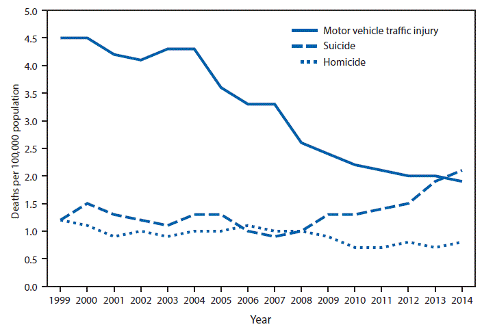 QuickStats: Death Rates for Motor Vehicle Traffic Injury,* Suicide,† and Homicide§ Among Children and Adolescents aged 10–14 Years — United States, 1999–2014