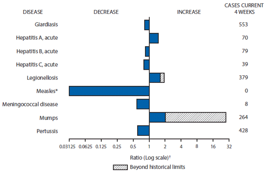 C.N.M.I.: Commonwealth of Northern Mariana Islands. U: Unavailable. —: No reported cases. N: Not reportable. NN: Not Nationally Notifiable. NP: Nationally notifiable but not published. Cum: Cumulative year-to-date counts. Med: Median. Max: Maximum. * Three low incidence conditions, rubella, rubella congenital, and tetanus, are in Table II to facilitate case count verification with reporting jurisdictions. † Case counts for reporting year 2015 and 2016 are provisional and subject to change. For further information on interpretation of these data, see http://wwwn.cdc.gov/nndss/document/ProvisionalNationaNotifiableDiseasesSurveillanceData20100927.pdf. Data for TB are displayed in Table IV, which appears quarterly. § Illnesses with similar clinical presentation that result from Spotted Fever Group Rickettsia infections are reported as Spotted Fever Rickettsioses. Rocky Mountain Spotted Fever (RMSF), caused by Rickettsia rickettsii, is the most common and well-known Spotted Fever. |