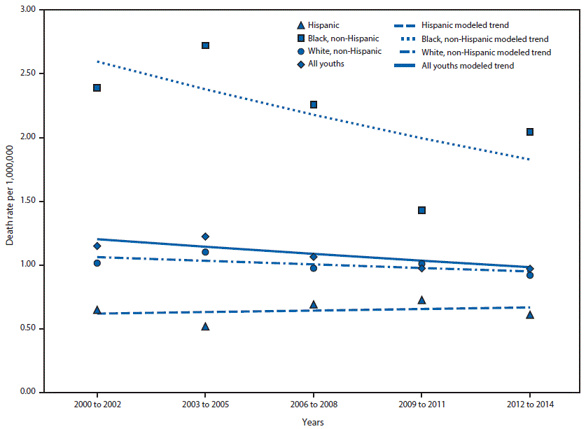 Diabetes mortality among persons aged 1–19 years during 2000–2014 was examined using information from death certificates filed in all 50 states and the District of Columbia (DC) and collected by CDC’s National Center for Health Statistics. Hispanic ethnicity was collected on death certificates for all 50 states and DC starting in 1997. A diabetes death was defined as one with an International Classification of Diseases, Tenth Revision underlying cause of death code of E10–E14. Annual U.S. Census estimates for persons aged 1–19 years (https://wonder.cdc.gov/wonder/help/cmf.html#Population) were used as the denominators. Mortality estimates were obtained from the CDC Wonder online database (https://wonder.cdc.gov/mortSQL.html). To produce stable mortality estimates, diabetes death rates were analyzed in 3-year intervals. Infants (children aged <1 year) were excluded because methods for calculating neonatal and postnatal mortality rates differ from those for children aged ≥1 year. Race/ethnicity was categorized into the following groups: non-Hispanic black (black), non-Hispanic white (white), Hispanic, and all races/ethnicities (all children and adolescents). Hispanic includes all Hispanic origins, and persons who are Hispanic can be of any race. There were too few deaths among the other race/ethnicity groups to produce reliable estimates for those groups.
