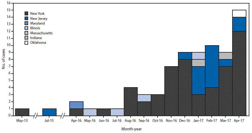 View suggested citationIn June 2016, CDC released a clinical alert about the emerging, and often multidrug-resistant, fungus Candida auris and later reported the first seven U.S. cases of infection through August 2016 (1). Six of these cases occurred before the clinical alert and were retrospectively identified. As of May 12, 2017, a total of 77 U.S. clinical cases of C. auris had been reported to CDC from seven states: New York (53 cases), New Jersey (16), Illinois (four), Indiana (one), Maryland (one), Massachusetts (one), and Oklahoma (one) (Figure). All of these cases were identified through cultures taken as part of routine patient care (clinical cases). Screening of close contacts of these patients, primarily of patients on the same ward in health care facilities, identified an additional 45 patients with C. auris isolated from one or more body sites (screening cases), resulting in a total of 122 patients from whom C. auris has been isolated.