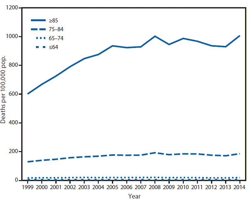 The figure above is a line graph showing the number of deaths per 100,000 population during 1999–2014, by four age groups: ≥85, 75–84, 65–74, and ≤64 years.