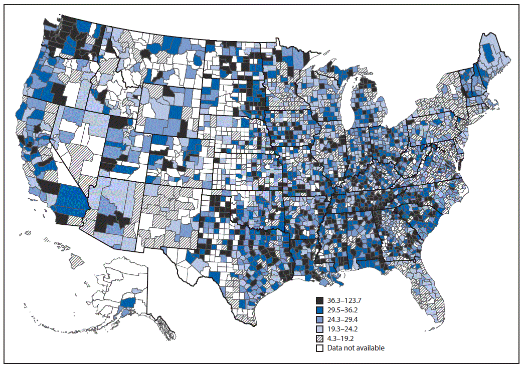 The figure above is a map of the United States showing the average annual age-adjusted death rate from Alzheimer’s disease per 100,000 population during 2005–2014 for each U.S. county.