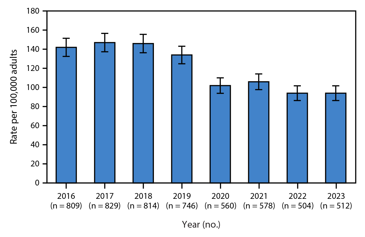 In Alaska, the average annual rate of newly reported chronic hepatitis C (cases per 100,000 adults) during 2016–2023 was 121; the rate decreased a relative 30% from 142 (2016–2019) to 99 (2020–2023). Rates decreased for most groups but were higher overall among males, persons aged 18–39 years, residents of rural areas, and American Indian or Alaska Native persons.