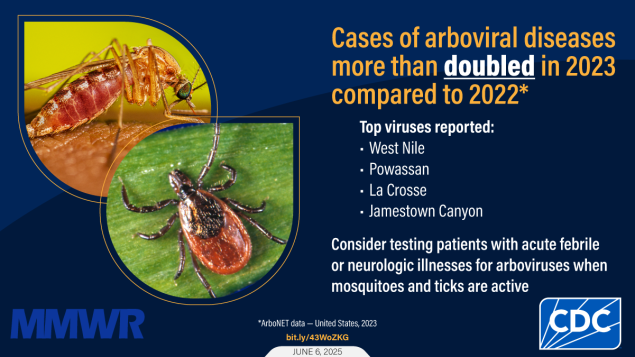 Suggested citation for this article: Padda H, Jacobs D, Gould CV, et al. West Nile Virus and Other Nationally Notifiable Arboviral Diseases — United States, 2023. MMWR Morb Mortal Wkly Rep 2025;74:358–364. DOI: http://dx.doi.org/10.15585/mmwr.mm7421a1.