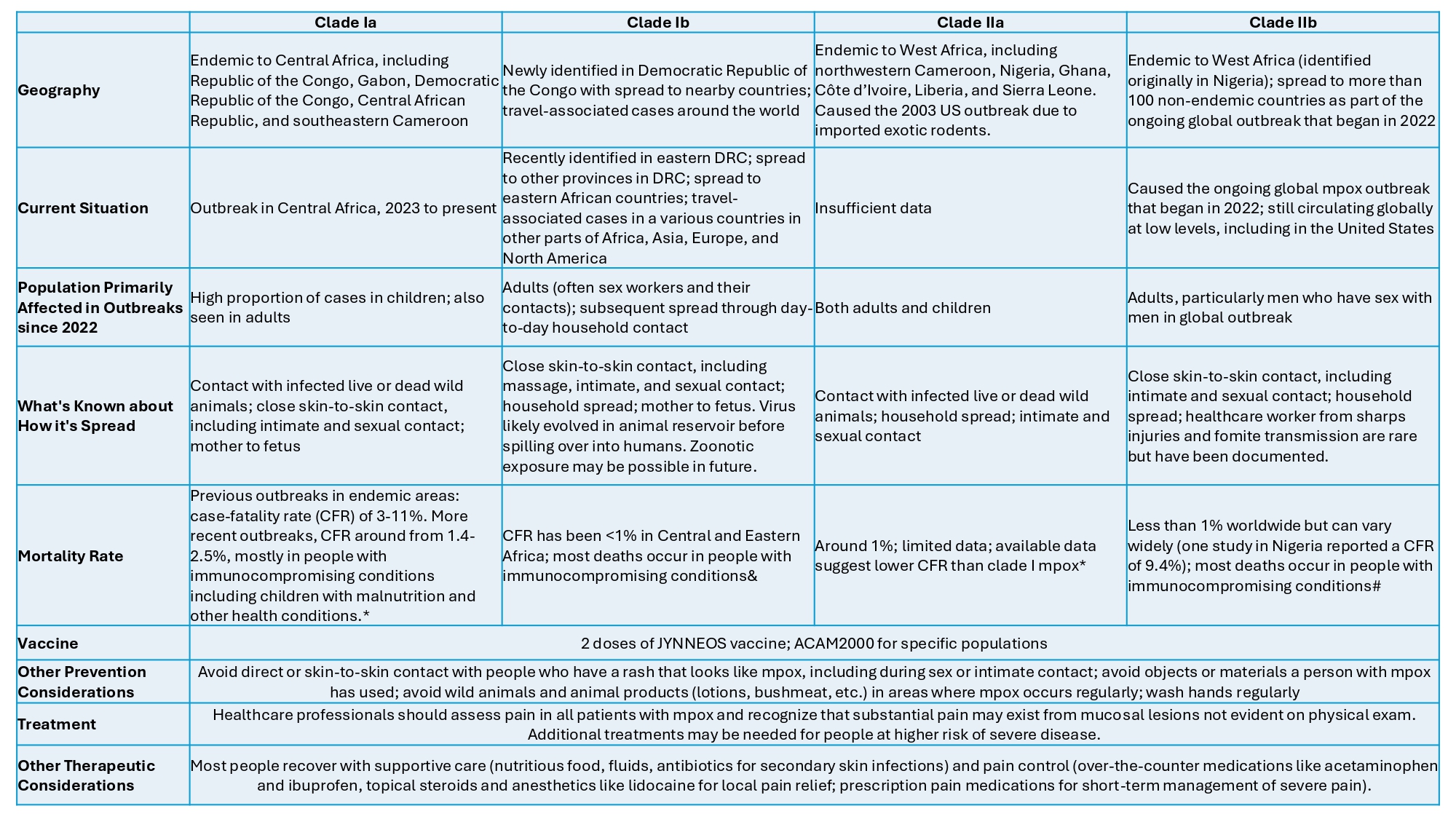 - El clado I es responsable del aumento actual de casos en África Central y Oriental. Históricamente, el clado I causó un mayor número de enfermedades graves que el clado II, y hasta un 10 % de las personas murieron a causa de él. Los brotes recientes han tenido tasas de mortalidad mucho más bajas, de entre el 1 y el 3.3 %.