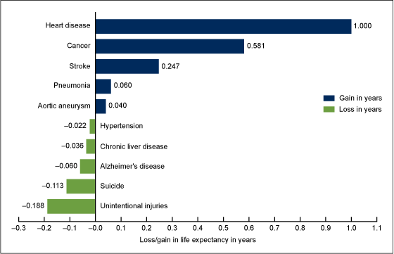 - The increase in death rates due to unintentional injuries, suicide, Alzheimer’s disease, chronic liver disease, and hypertension contributed a loss of 0.419 years to the change in life expectancy.