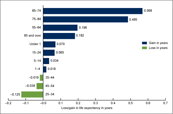 - The increase in all-cause age-specific death rates for ages 25–34, 35–44, and 45–54 contributed a loss of 0.182 years to the change in life expectancy.