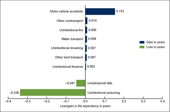 - The decrease in death rates due to motor vehicle, other transport, unintentional fire, water transport, unintentional drowning, other land transport, and unintentional firearms contributed 0.197 years to the change in life expectancy at birth (Figure 5).