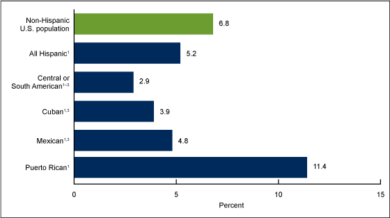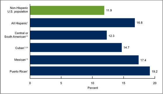 Lucas JW, Freeman G, Adams PF. Health of Hispanic adults: United States, 2010–2014. NCHS data brief, no 251. Hyattsville, MD: National Center for Health Statistics. 2016.