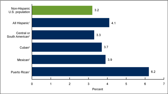 - After age adjustment, Puerto Rican adults (6.3%) were more likely than Central or South American (3.1%), Cuban (3.1%), Mexican (4.7%), and
