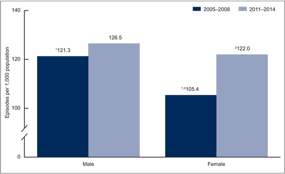 - From 2005–2008 to 2011–2014, the injury rate among females increased 16%, from 105.4 to 122.0 episodes per 1,000 population, while the rate among males did not change.