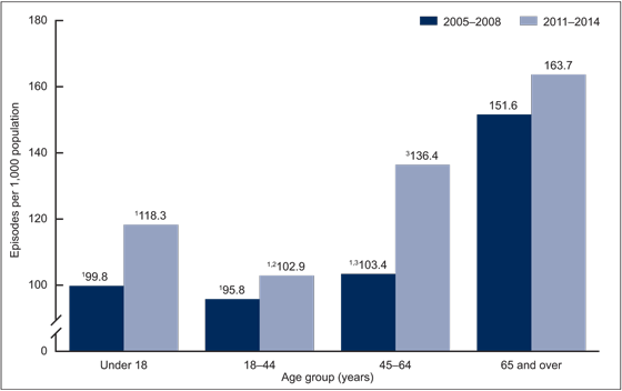 - From 2005–2008 to 2011–2014, a significant increase in the rate of injury episodes was observed for the 45–64 age group. For women aged 45–64, the rate increased 32%, from 103.4 episodes per 1,000 population in 2005–2008 to 136.4 in 2011–2014. The change in rates for other age groups was not statistically significant.